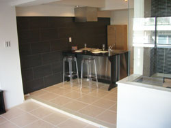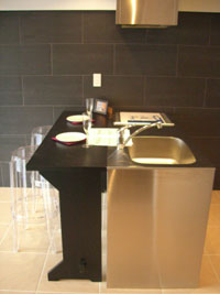 ≪キッチン≫壁のモノトーン石張りでスタイリッシュに! シンプルなキッチンにカウンターを配置して機能的に