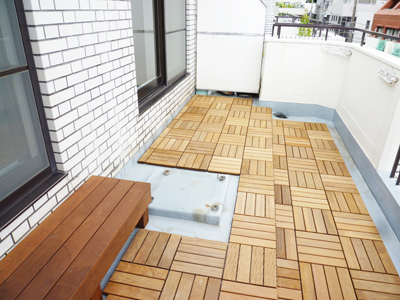 (バルコニー)六本木でありながら、ゆったりとウッドデッキで過ごせるよう踏み台兼ベンチも制作し、ゆとりある空間にしました。
