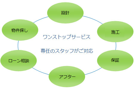 物件探し+設計・施工・ローン相談・保証がひとつにまとまったワンストップサービスで安心です